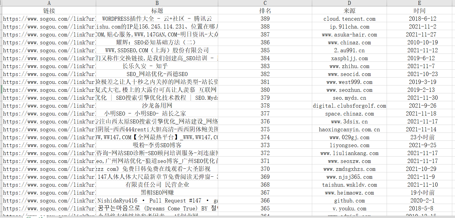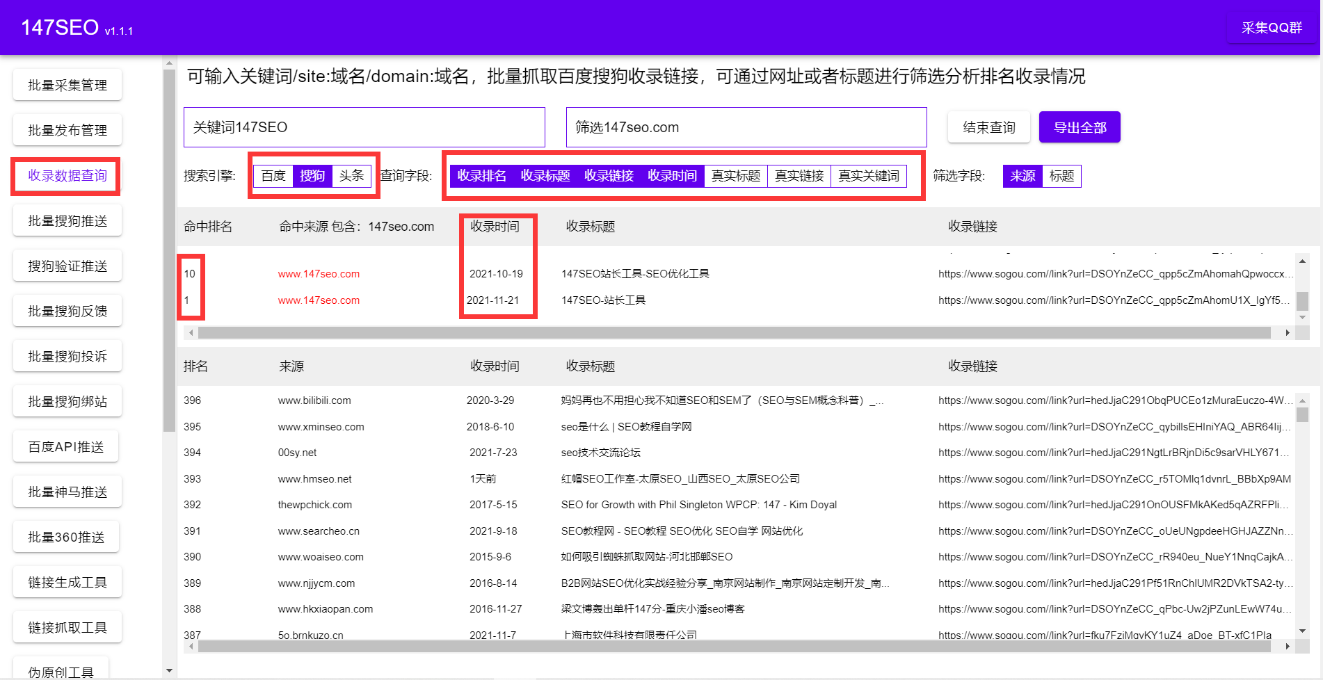 1、收录排名、收录标题、收录链接、收录时间、真实标题、真实链接、真实关键词,一次性全部查询统计出来
