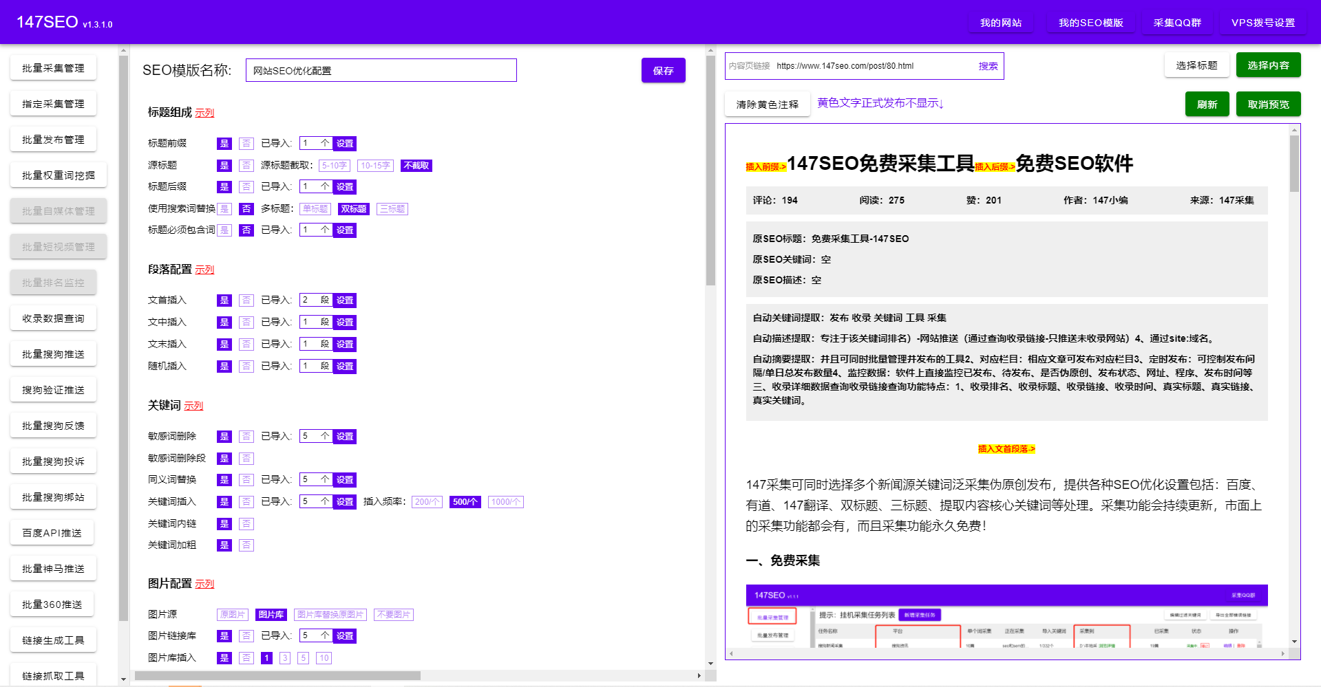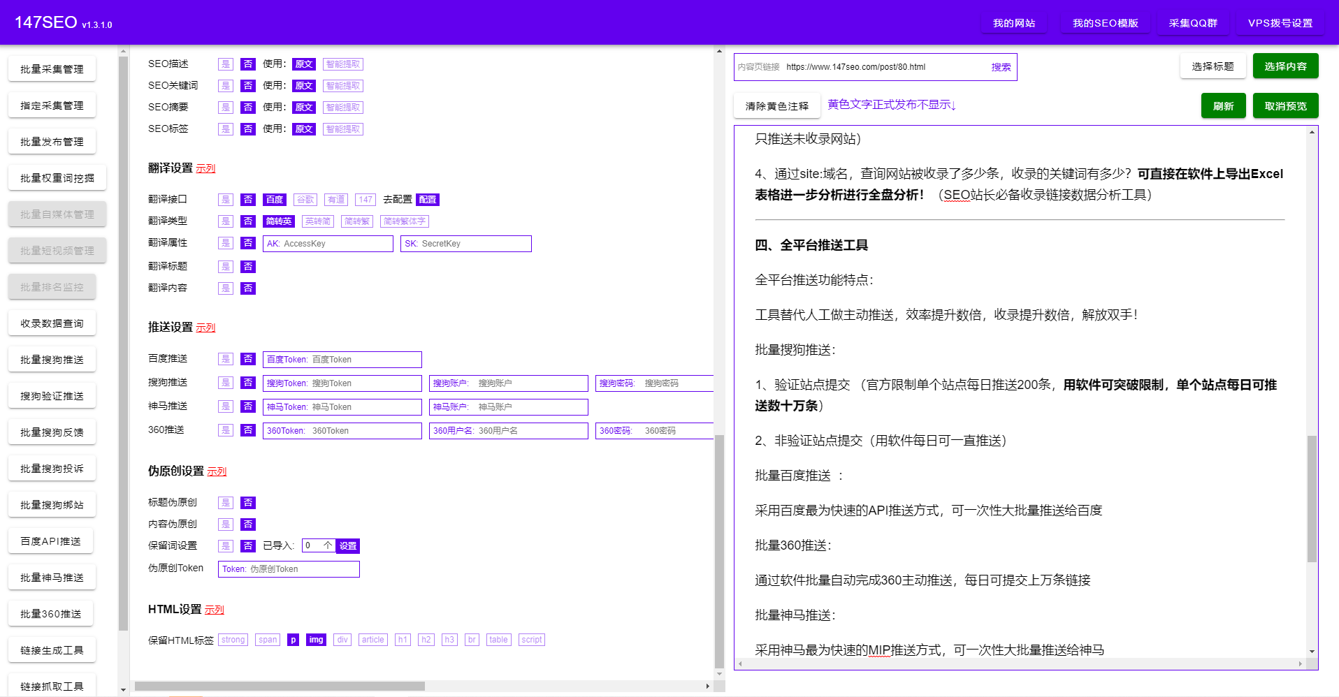 5、同时配备了批量内容处理功能以及全能SEO配置