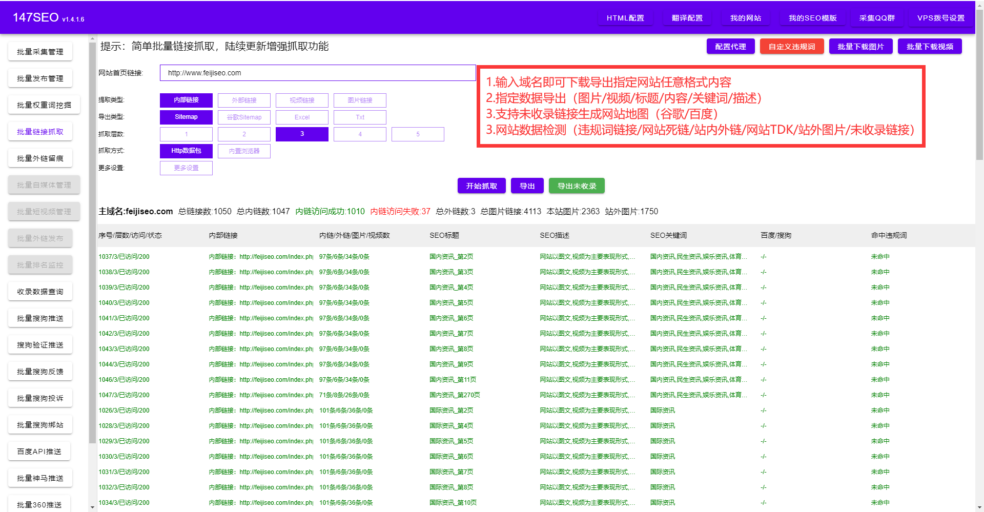 指定域名爬取导出作用:不仅可以导出网站的所有信息,还可以对网站所有信息进行一个全面检测与分析(网站死链/网站中存在的外链/网站标题/网站关键词/网站描述/网站未收录链接/网站外图片/等),只有了解自己的网站,了解对手的网站,才能让网站的排名越高流量越大。