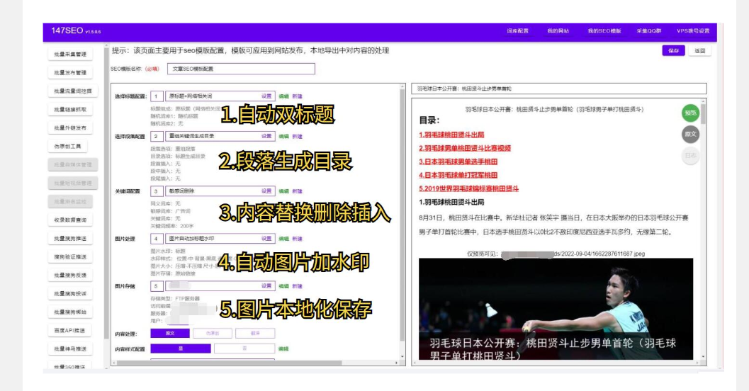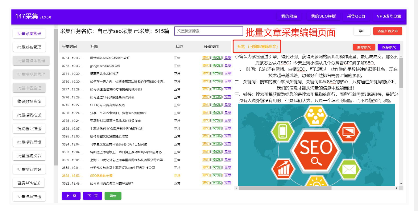 4、内容编辑处理 147SEO工具支持全网关键词采集和指定采集,采集内容支持标签保留、图片去水印、图片云储存和过滤敏感信息,让我们收集的文章素材纯粹干净 147SEO工具还可以管理不同CMS,不论是主流CMS还是小众的CMS等,都能使用,实现多个网站文章自动更新。