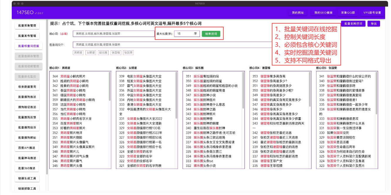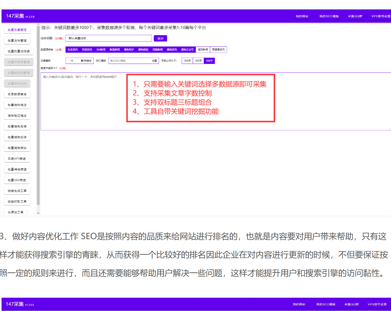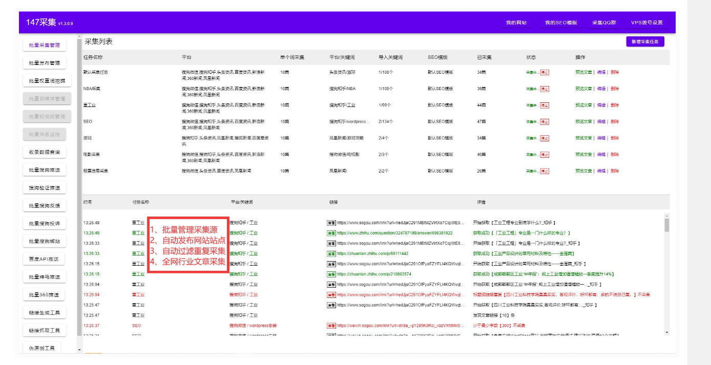 147SEO工具具有关键词挖掘、关键词采集、文章伪原创、内容批量处理等各类SEO功能,支持WordPress、zbolg、织梦CMS等各类CMS的管理和文章发布,可视化的页面只需要我们鼠标点选,就可以完成文章素材收集到内容自动更新发布的全过程内容管理工作。