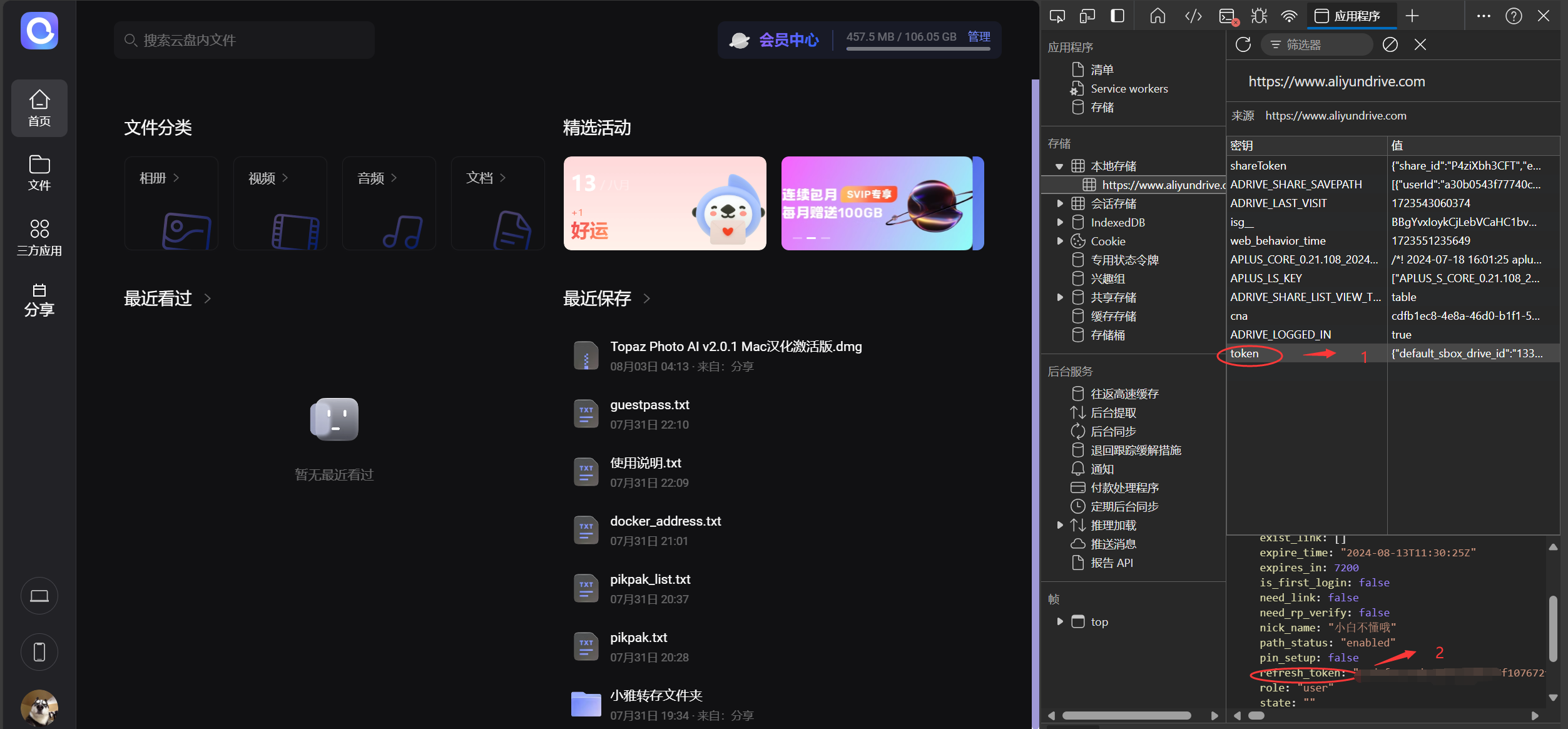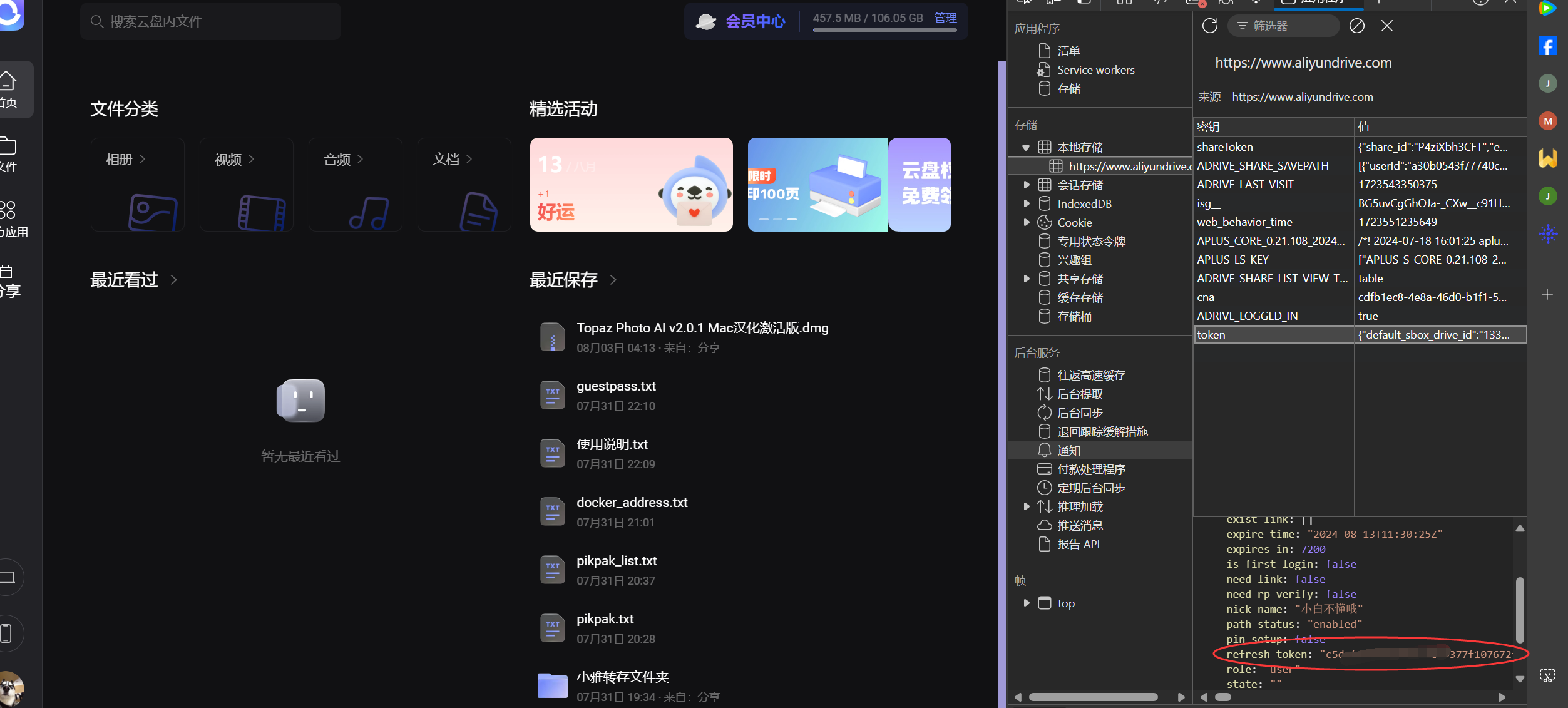 请注意,获取refresh_token或cookie可能需要您已经登录到阿里云盘,并且在某些情况下,网站的更新或安全设置可能会影响这些步骤的有效性。此外,获取和使用这些信息时,请确保遵守相关的隐私政策和法律法规,不要用于任何非法或未经授权的活动。