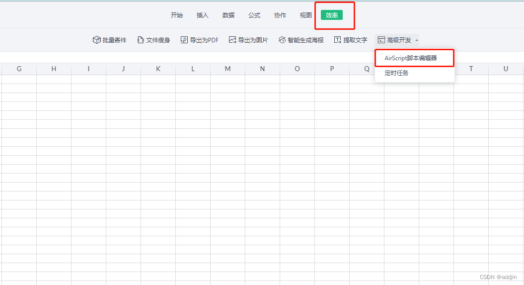 2、新建一个空表格,点击【效率】-【高级开发】-【AirScript脚本编辑器】