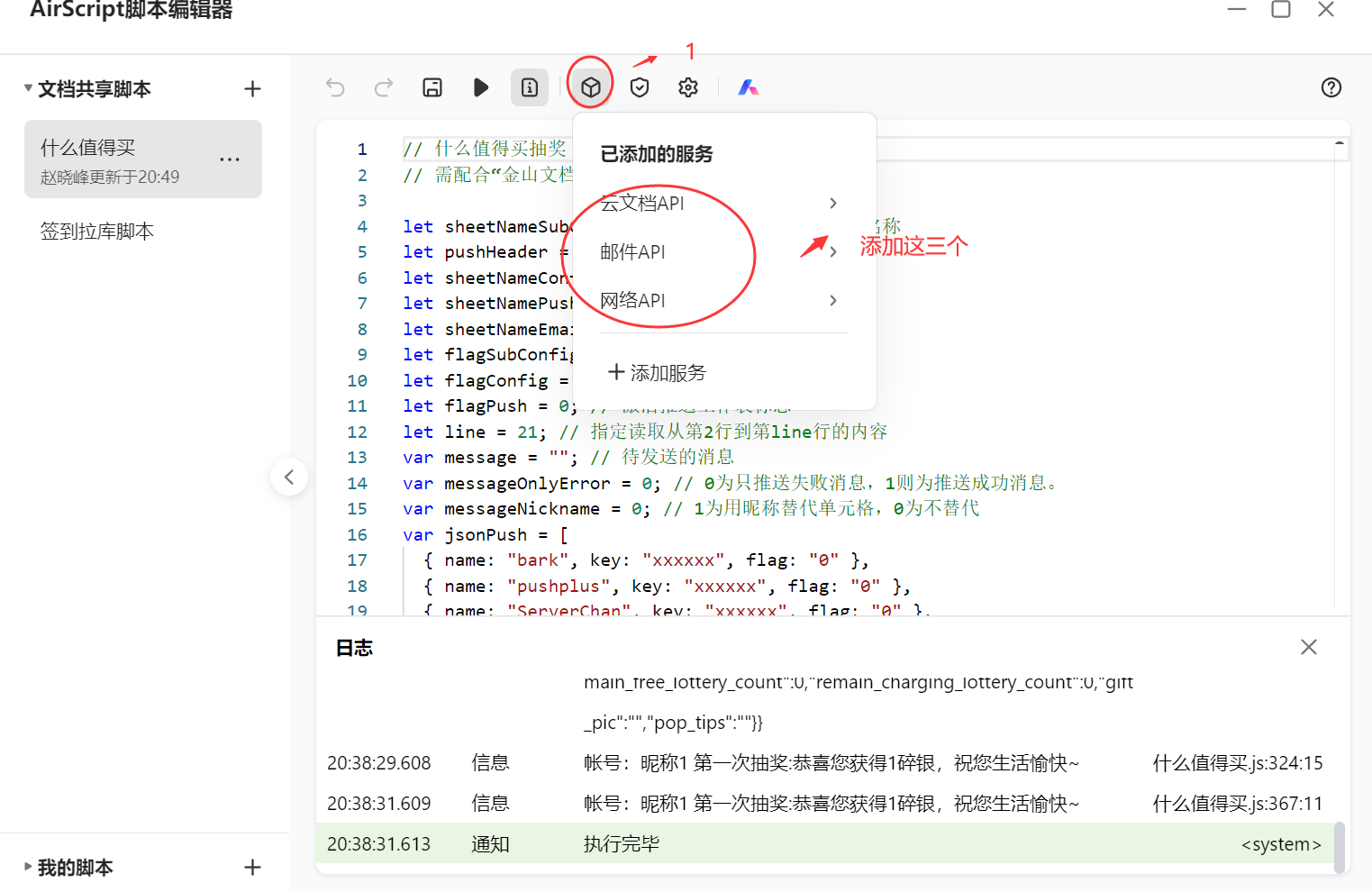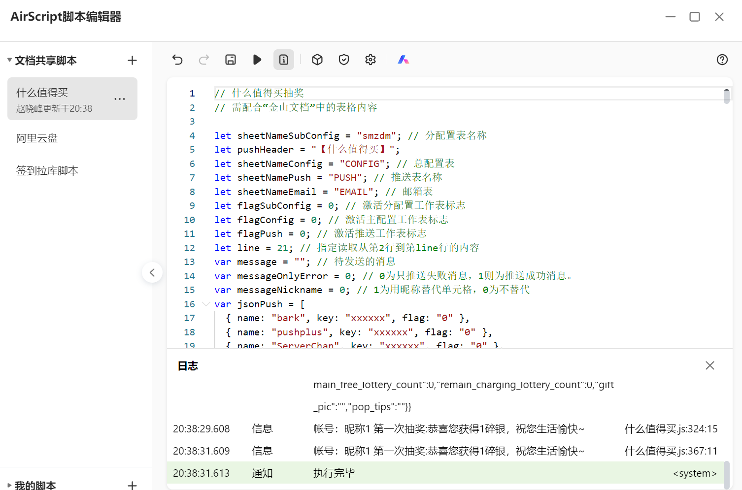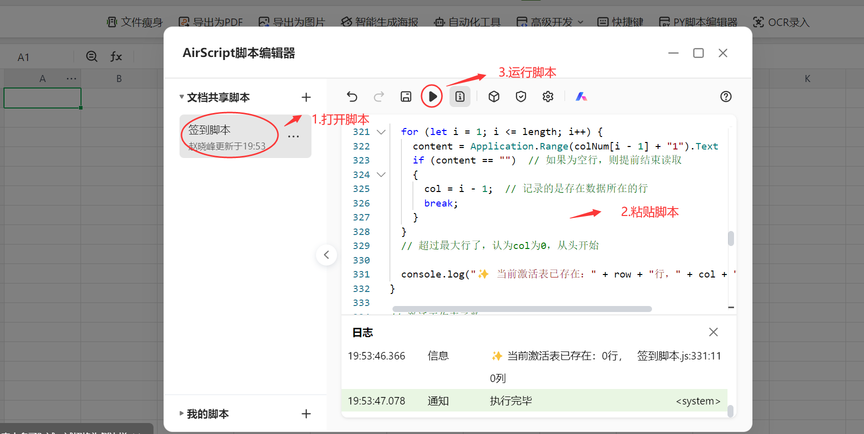 将复制好的代码粘贴到我们事先创建的AirScript脚本编辑器签到脚本中。然后运行脚本!