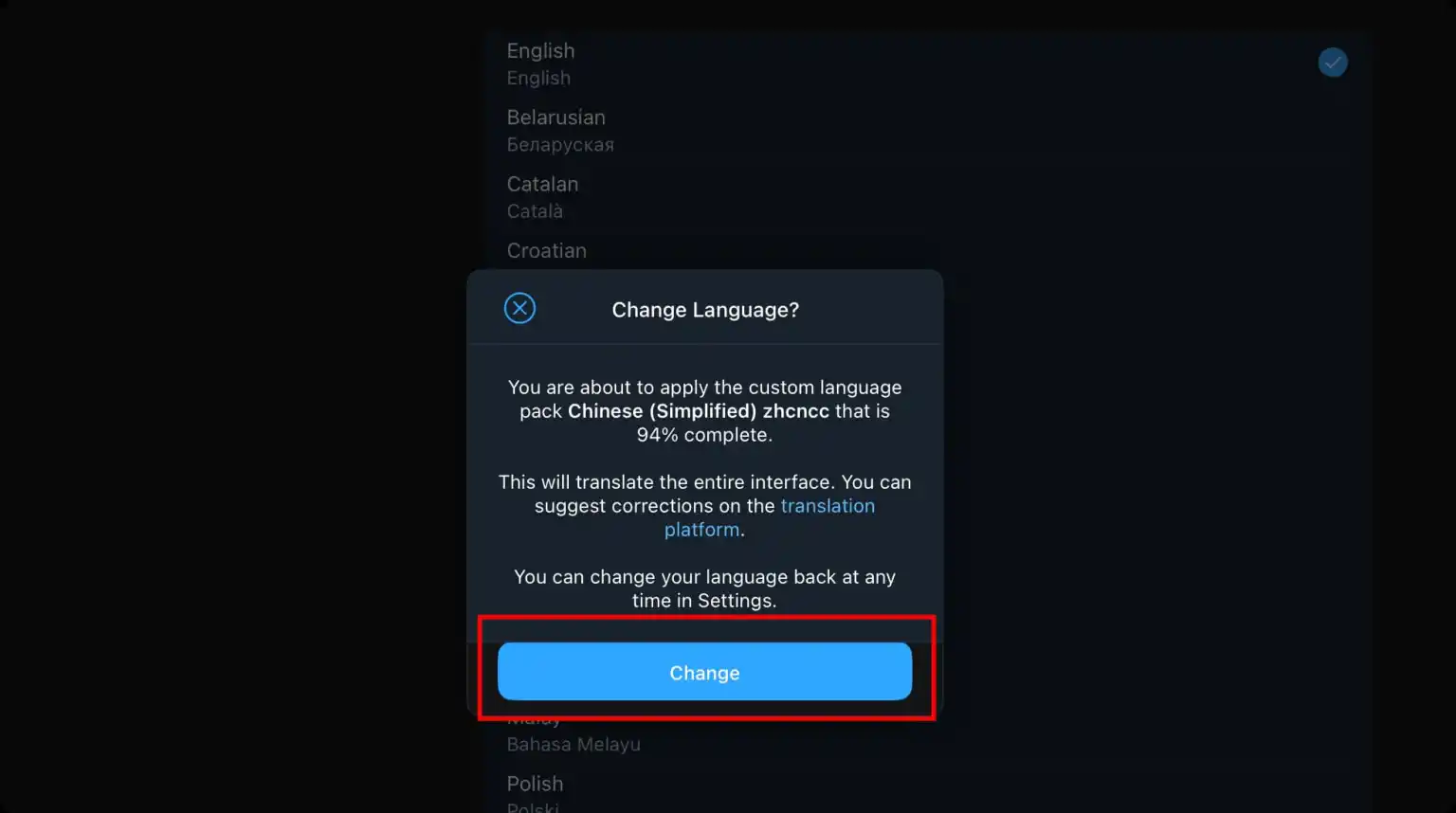 4、在 Telegram App 内会出现一个弹窗,上面显示了该自定义语言包的翻译进度(94%);点击 Change 按钮, 自动切换界面语言。