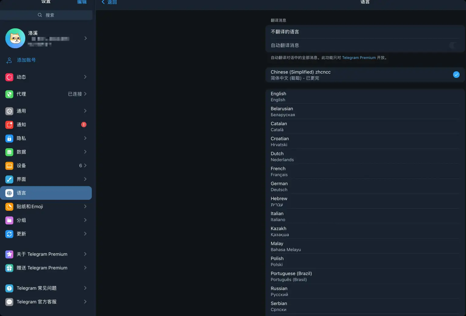 很快,Telegram App 将会设置成刚导入的中文语言。
