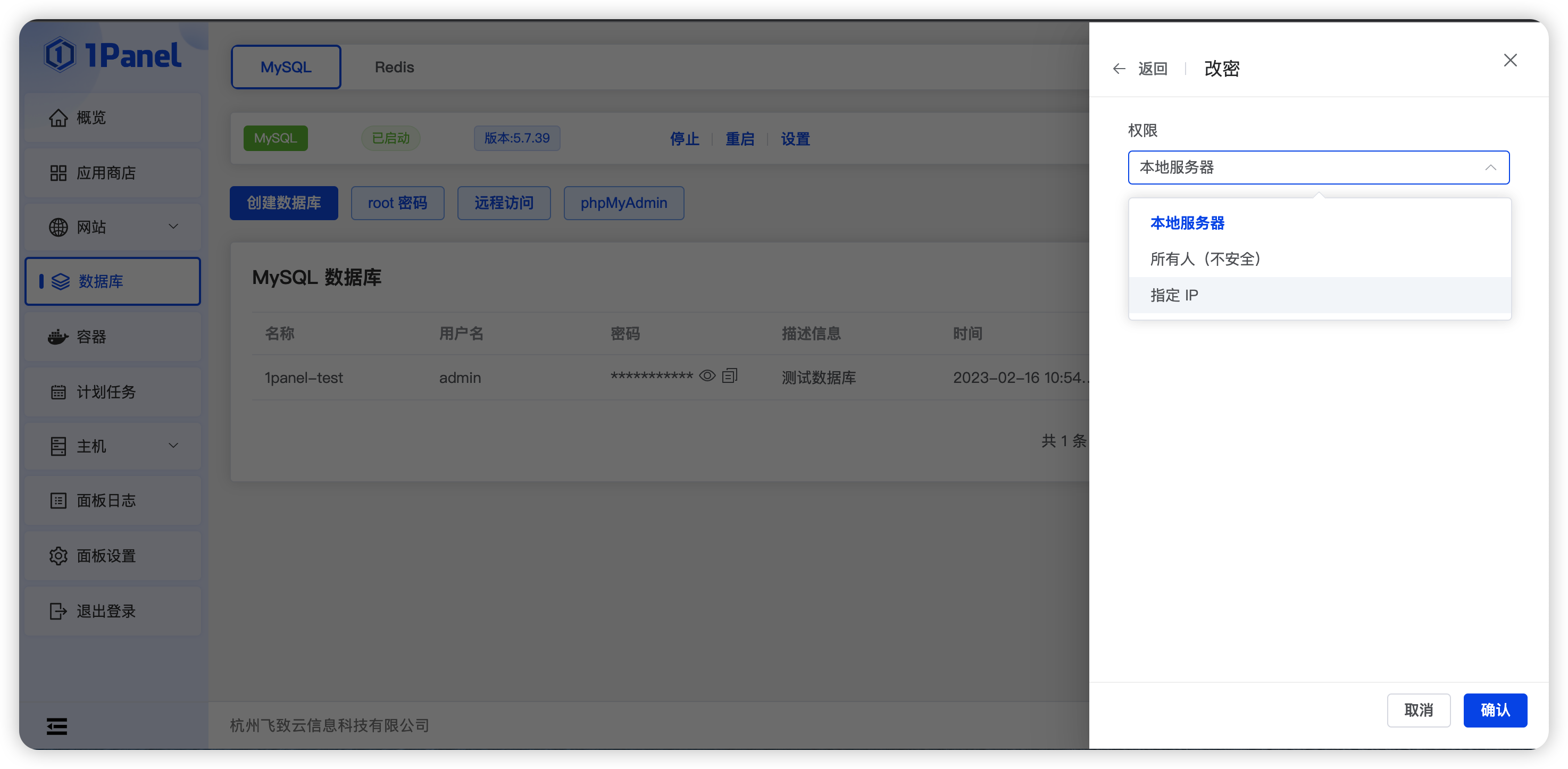 访问权限:默认权限本地服务器权限,选项有:本地服务器,所有人,指定 IP。