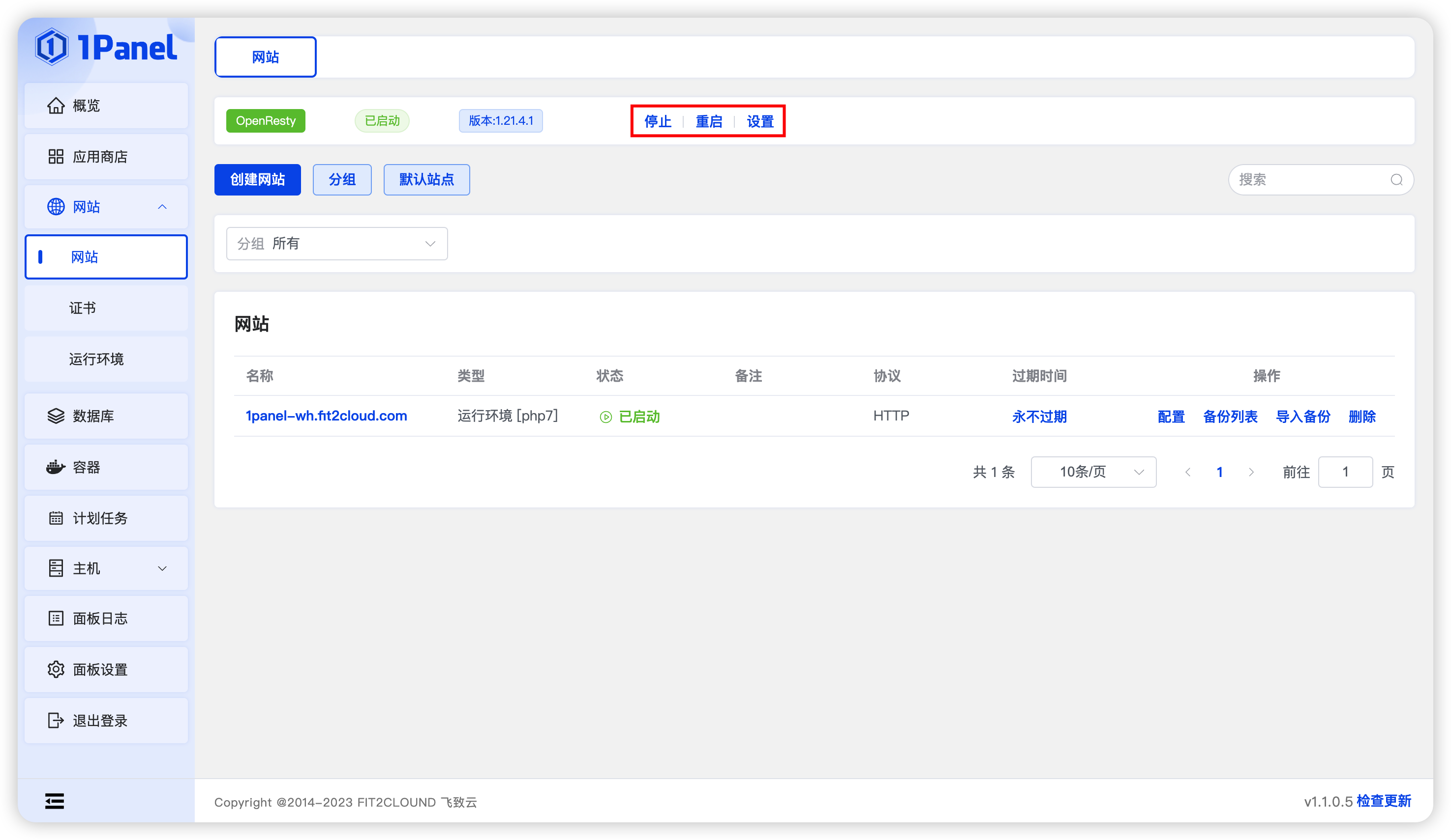 网站列表上方的工具栏,可以查看并配置 OpenResty。