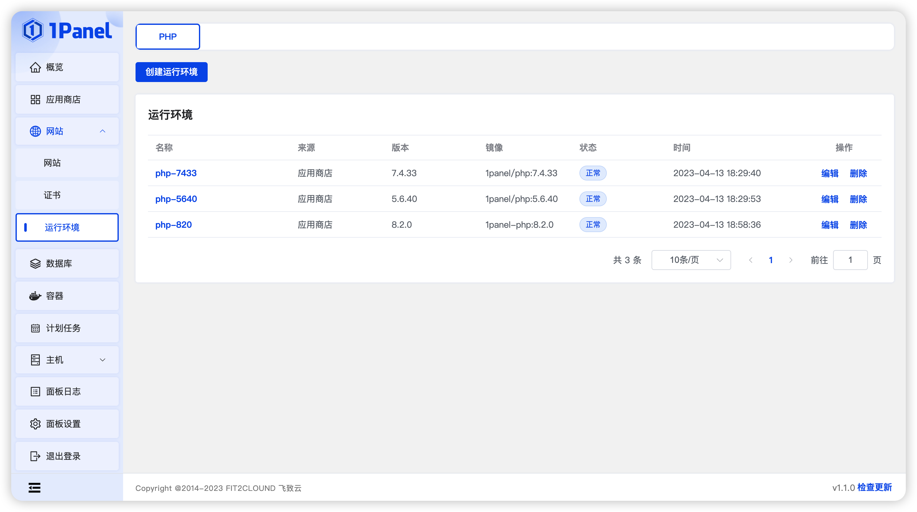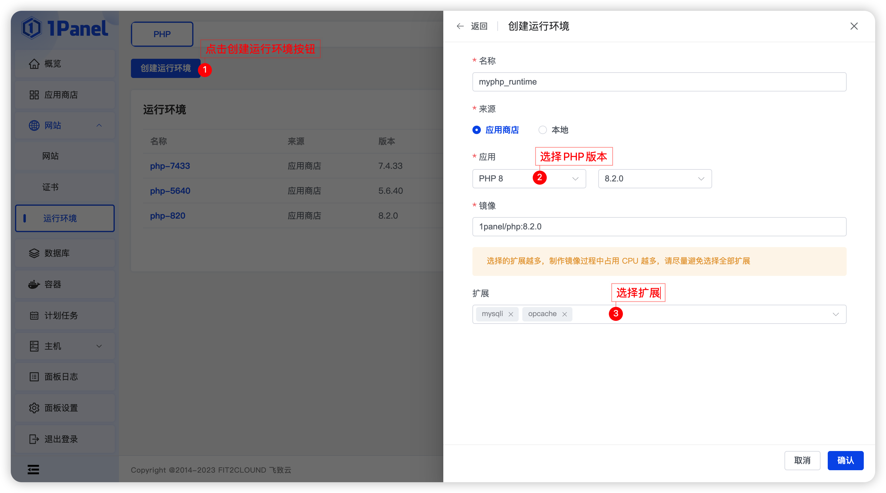 点击创建运行环境按钮,选择 PHP 版本和扩展