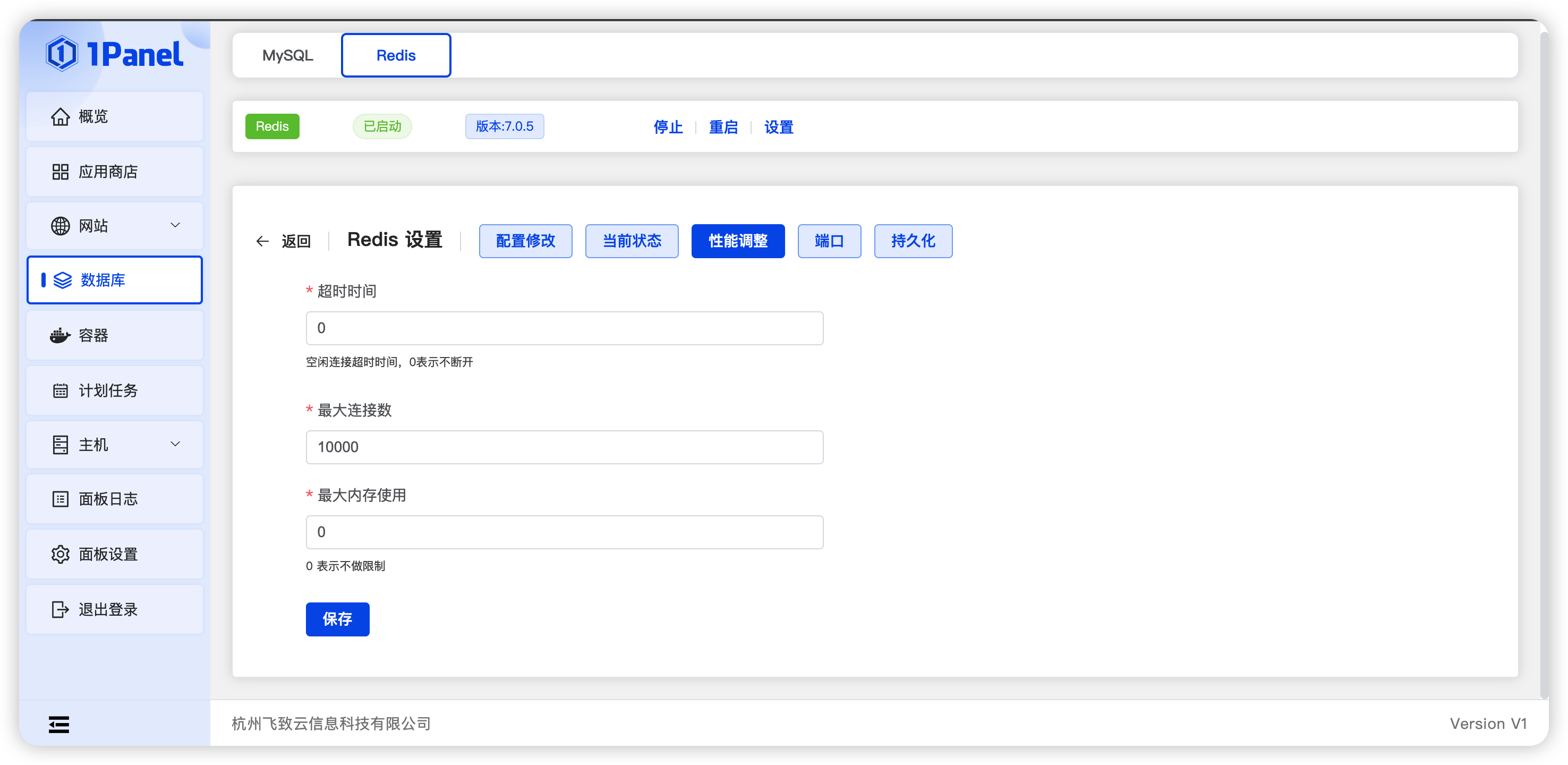 系统支持表单方式直接调整 Redis 相关参数,具体包括:超时时间、最大连接数、最大内存数。