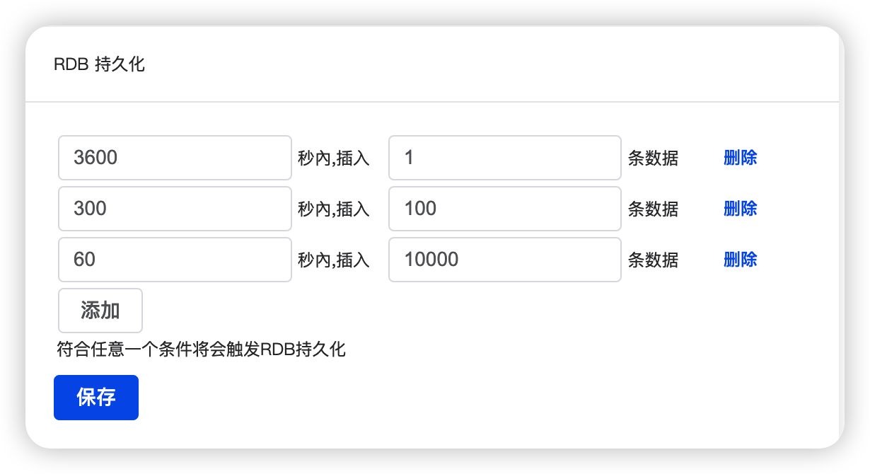 设置持久化策略,当 Redis 满足其中任意一个条件时,将触发 RDB 持久化。